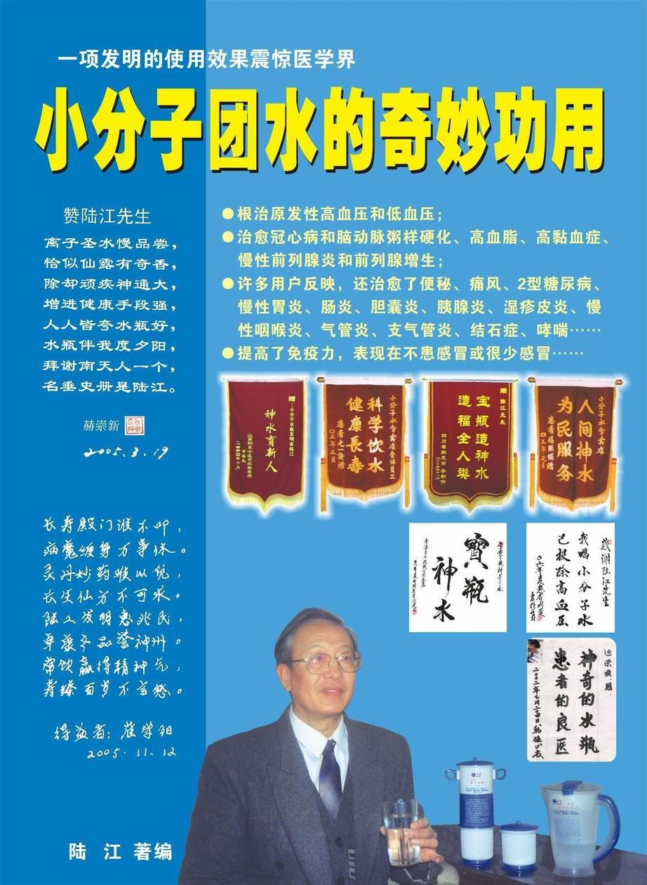 人類幾千年來患以上病癥需終生服藥,幾十年也不能治愈。可是我國南寧的高級工程師陸 江,于1990年想根治高血壓,研究發明了離子水瓶,處理出微小分子團水供飲用,經過醫院臨床試用和專家鑒定,1999年獲中國發明專利權,產品于2000年投放市場后一直跟蹤調查,據全國各地用戶反饋:祛除了高低血壓、糖尿病和冠心病,并使前列腺增生、咽喉炎、鼻竇炎、慢性氣管炎、支氣管炎、矽肺病、哮喘、慢性胃炎、腸炎、慢性膽囊炎、慢性腎炎、腎衰、膀胱炎、便秘、痔瘡、風濕性關節炎和濕疹皮炎及中風后遺癥等病癥不藥而愈。為什么喝微小水能治20多種???陸 江從1991年德國科學家發現細胞膜水通道僅為2納米獲得啟發,認為多種器官患病是因細胞脫水,不能正常代謝和分裂增殖,才使器官細胞減少致衰弱萎縮而形成細胞缺水性病癥。22年來的實踐有力地支持了“細胞脫水致病”這一重要論點,表明喝微小水可滿足細胞的生理需求,補水就能祛病,是生命科學新亮點。